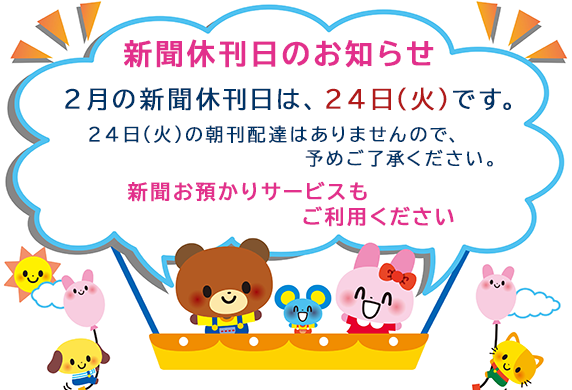 【休刊日のお知らせ】2月の新聞休刊日は、24日(火)です。24日(火)の朝刊配達はありませんので、予めご了承ください。